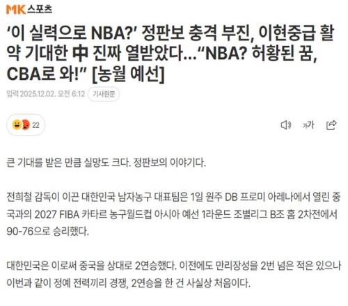 韩媒《MK体育》写道:就这水平还想打NBA?曾凡博世预赛发挥低迷,李贤重的表现出色让中国球迷愤怒,NBA是不切实际的梦想,曾凡博还是回CBA吧。 文中写道:这是曾凡博的故事,期望越大,失望就越大。在两队的赛前,韩国主帅全熙哲曾评价曾凡博:他有着超越吕俊锡的运动能力,且还具备李贤重那样的外线投射能力,他的加盟会让中国男篮锋线实力更强。
