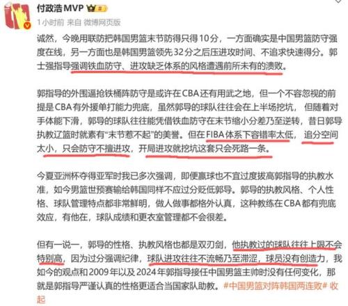 另外,媒体人付政浩也同样发文点评了这场比赛,他一针见血指出郭士强强调的防守和进攻缺乏体系的风格,就是造成中国男篮在世预赛吞下两连败的原因。付政浩表示,郭士强的外围铁桶阵防守或许在CBA还有用武之地,但前提是CBA有外援单打能力兜底,但在FIBA体系下,中国队追分空间太小,只会防守不擅进攻,开局进攻就挖坑只会是死路一条。