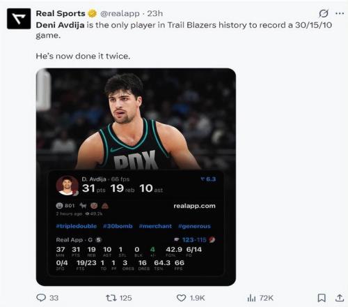 这场比赛阿夫迪亚也一战创造多项纪录: 1.职业生涯第四次三双; 2.生涯第二次30+三双,本赛季第二多的30+三双;