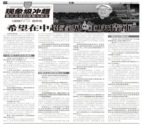 ◆《足球》:感觉您对重庆足球感情很深。 张外龙:当然,在中国有很多执教经历,只有重庆三次都选择了我,这座城市对我的感情也非常深。 ◆带队的这几轮比赛,晚上睡得怎样? 几乎没有睡过一个好觉。有时候准备比赛到凌晨一两点才睡,最晚四点才睡。球队训练数据、比赛数据,包括比赛的战术安排等,要准备的东西太多了,所以睡不了多长时间。 ◆两江竞技解散之前,重庆队拿到了队史最好成绩,冲超和拿到中超最好成绩,哪一个更有成就感? 冲超这天我的情感更强烈一些。首先我们给年轻球员创造了舞台,他们之后的发展是可以预期的。而且这种失而复得的心理,我觉得比原本拥有的更值得珍惜。所以,我认为现在我们做到的更有成就感。 ◆庆功仪式上给球员们行了跪拜礼,这个动作表达了什么情感?当年两江竞技保级关键战前,您也给外援做过同样的动作,这两次有什么不同? 这次是我发自内心表达感恩的一种方式。在这么短时间里,全队为了共同目标全力以赴,我必须用最真诚的方式向他们致敬。 当年向外援费尔南迪尼奥下跪,是希望他作为唯一的外援在极度困难的局势下能够与大家同心作战。虽然背景不同,但我对球员的真心、信任与感谢是完全一致的。这种行为可能因为国家文化差异而导致大家的理解不同,但在韩国,这是最高的感谢方式。 ◆很多职业教练在临时接手一支球队的时候,都会签附加条款,比如完成目标了再续一年,为什么只和俱乐部签了7轮合同? 当时球队局势危急,如果再耽误一天,冲超希望就可能消失。合同条款并不是我优先考虑的问题,我接受短合同,是因为我只想尽快把球队从危机中拉出来。我对结果有信心,也相信重庆足球的未来方向。现在回过头看,我为自己的选择和贡献感到自豪,也希望这份成果能够得到应有的延续,能继续带领这支年轻有希望的球队在更高的舞台展现重庆足球的精神。 ◆重庆足球经历过重创,您认为未来应该如何平稳发展? 首先,重庆足球需要一个憧憬、一个计划、一个目标,毕竟这支球队的球员都非常年轻,很有潜力。为了这些球员的发展,俱乐部要有更多长远规划,才能在中超站稳脚跟。