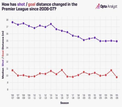 近十几年,英超的平均射门(紫)和进球(红)距离总体走低。 有人质疑依赖远射进球并非长远之计,毕竟你不可能一直有这种好运气。作为参考,自2003-04赛季有记录以来,英超85.7%的进球是在禁区内打进的,平均转化率为15%,另外14.3%的进球来自禁区外,平均转化率为3.7%。本赛季至今,英超15.6%的进球来自禁区外,为2013-14赛季(17.7%)以来的最高比例,但显然到赛季结束时,这一比例很可能会大幅“平衡”下来。 从埃梅里赛后的言论来看,他也担心透支运气会给他们以后带来麻烦,“球员们的射门感觉很棒,把握机会的能力也很强,但我们当然希望能有更多得分手段。我们需要用不同的方式增加进球。”不过既然重炮手们个个脚风正顺,埃梅里也没理由不好好利用。不妨反过来假设,如果你的球队总是能在小禁区内头球破门得分,你不会突然停止传中吧?阿森纳也没有停止用角球进球啊。 需要指出的是,维拉能在积分榜上扶摇直上,并不仅仅归功于他们逆天的远射得分率,门将埃米利亚诺·马丁内斯本赛季表现出色——尽管被剥夺了副队长职务——场均扑救1.4个,扑救成功率高达77.1%,全队非点球失球数仅为10个,仅次于领头羊阿森纳(7个)。 有人说,“维拉让xG变得毫无意义”,但其实重点不在于xG是否有意义,而在于维拉的远射效率达到了一个前所未有的高水平,并帮助他们强势反弹回到积分榜头部,这才是值得庆祝的。
