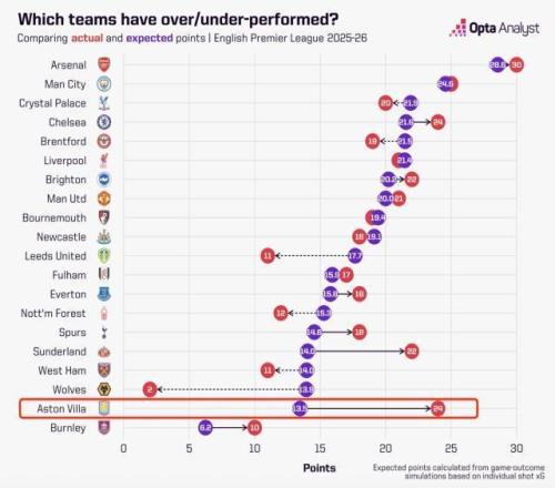 维拉是本赛季英超最“离谱”的球队,预期13.5分实际拿到24分,反面则是狼队,同样预期13.5分,实际只有2分。 |