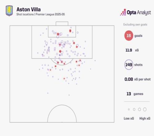 卡马拉的世界波帮助维拉在德比中全取3分。 卡马拉的进球是维拉本赛季在禁区外打入的第9粒英超进球,这使他们成为一个异类。实际上,如果排除任意球和点球,本赛季英超的平均射门距离(14.9米)和平均进球距离(9.8米)是2006-07赛季有数据记录以来的最低值。也就是说,如今英超球队更倾向通过缩短射程,提高射门命中率——即预期进球值。这很符合常理。 然而,埃梅里和他的球队似乎对预期进球值“嗤之以鼻”。截至英超第13轮,维拉总共打进16球,只能排到第13位,预期进球则是11.88,仅好于升班马伯恩利(9.69),排名倒数第二。而且他们所有射门的平均预期进球数(0.08)也是英超20支球队中最低的,这意味着维拉并没有经常创造出高预期值的射门机会。 从数据分析的角度,维拉的预期进球值是非常令人担忧的,他们本赛季在英超场均预期进球仅为0.91,自2012-13赛季以来,只有16支球队在完整赛季的场均预期进球值低于或等于0.91,而其中12支球队最终降级。当然,与完整赛季相比,维拉目前的样本较小。