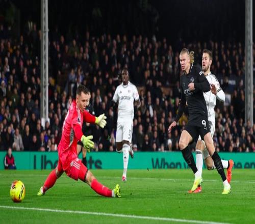 这是哈兰德的英超100球里程碑,哈兰德也改写了英超的历史,打破了希勒(124场)保持的英超最快100球纪录,仅仅用时111场。 第24分钟,富勒姆完成本场比赛的第一次射门,史密斯罗的劲射颇具威胁,多纳鲁马做出关键扑救。