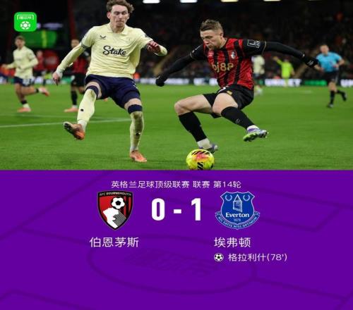 北京时间12月3日,2023-2024赛季英格兰足球超级联赛第14轮,伯恩茅斯主场迎战埃弗顿。上半场,克鲁皮破门因越位在先被吹。下半场,格拉利什射门,击中后卫折射入网。全场比赛结束,埃弗顿客场1-0击败伯恩茅斯。 关键事件 第80分钟,格拉利什射门,皮球击中后卫折射入网,埃弗顿1-0