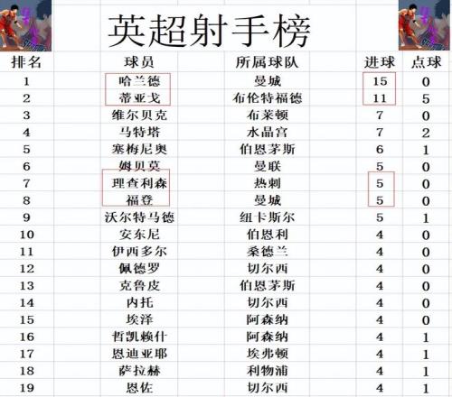 射手榜方面,哈兰德今天打入一球,15球继续高居榜首,蒂亚戈11球紧随其后位列第2。维尔贝克,马特塔7球并列第3,塞梅尼奥6球排在第5。福登近两轮连场梅开二度,2轮打入4球,追上理查利森,姆贝莫等人5球并列第6。 |