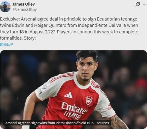 罗马诺发推:阿森纳已经和山谷独立俱乐部就收购16岁的双胞胎兄弟埃德温-金特罗以及霍尔格-金特罗达成了协议。 金特罗兄弟本周就已经飞往伦敦完成交易,协议已经达成。 两笔交易将在2027年他们年满18岁之后正式完成。 HWG了,就不用再说了,欢迎加盟! 从这P图上来看,长得都有点像内马尔……来看BBC消息吧,而且至少有真人配图!