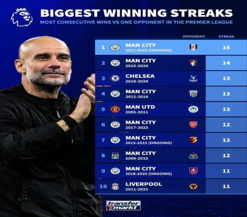 | 德国转会市场网站列出了英超历史对阵同一球队最长连胜排行榜,曼城对富勒姆16连胜居首,排名第二的是曼城对伯恩茅斯14连胜。