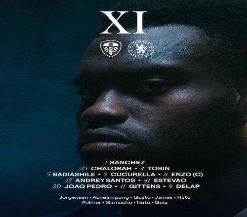 切尔西首发:1-罗伯特-桑切斯、5-巴迪亚西勒、23-特雷沃-查洛巴、3-库库雷利亚、4-阿达拉比奥尤、17-安德雷-桑托斯、8-恩佐-费尔南德斯、41-埃斯特旺、11-比诺埃-吉滕斯、9-德拉普、20-若昂-佩德罗 替补:7-佩德罗-内托、10-帕尔默、12-菲利普-约恩森、21-哈托、24-里斯-詹姆斯、27-古斯托、34-乔希-阿昌庞、38-吉乌、49-加纳乔 利兹联首发:1-卢卡斯-佩里、15-比约尔、2-博格尔、5-斯特鲁伊克、3-古德蒙松、6-乔-罗顿、18-施塔赫、22-田中碧、4-阿姆帕杜、14-卢卡斯-恩梅加、9-卡尔弗特-勒温 替补:10-皮罗埃、11-阿伦森、19-奥卡福尔、20-杰克-哈里森、23-博尔瑙、24-詹姆斯-贾斯廷、26-达洛、29-尼奥托、44-伊利亚-格鲁耶夫
