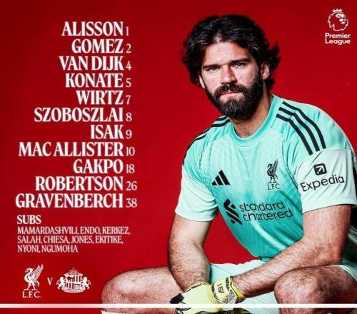 利物浦vs桑德兰:伊萨克搭档加克波,维尔茨、索博斯洛伊出战