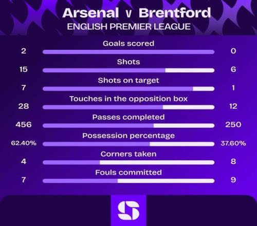 | 体坛周报全媒体原创 阿森纳2比0布伦特福德 11'梅里诺,90+1'萨卡 英超联赛第14轮,榜首阿森纳坐镇主场迎战布伦特福德。第11分钟,梅里诺接本·怀特传中头球破门先拔头筹。此后阿森纳发动猛烈的攻势,但均被凯莱赫化解。比赛最后时刻,萨卡锁定胜局,阿森纳2比0击败布伦特福德,继续以5分优势领跑积分榜。