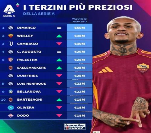 1. 迪马尔科(国际米兰)5000万欧元 2. 韦斯利-利马(罗马)3500万欧元 3. 安德烈亚-坎比亚索(尤文图斯)3000万欧元 4. 卡洛斯-奥古斯托(国际米兰)2600万欧元 5. 帕莱斯特拉(卡利亚里)2500万欧元 5. 萨勒马克尔斯(AC米兰)2500万欧元 5. 邓弗里斯(国际米兰)2500万欧元 8. 路易斯-恩里克(国际米兰)2300万欧元 9. 贝拉诺瓦(亚特兰大)2200万欧元 10. 巴尔泰萨吉(AC米兰)1800万欧元 10. 马蒂亚斯-奥利韦拉(那不勒斯)1800万欧元 10. 多多(佛罗伦萨)1800万欧元 |