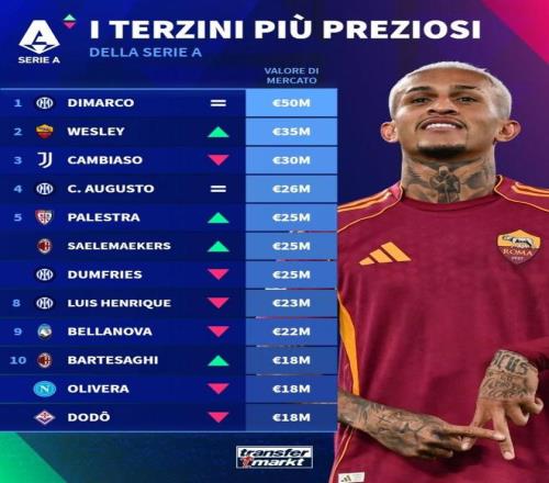 消息来源:共和报 3 - 迪马尔科是世界第一 德转本周更新了意甲最新身价,今日德转晒出了意甲边后卫的身价TOP10榜单的,迪马尔科5000万欧继续排在第一,罗马右后卫韦斯利升至3500万欧超越坎比亚索来到第二位的。 具体TOP10如下 1、迪马尔科 国米 5000万欧 2、韦斯利 罗马 3500万欧 3、坎比亚索 尤文 3000万欧