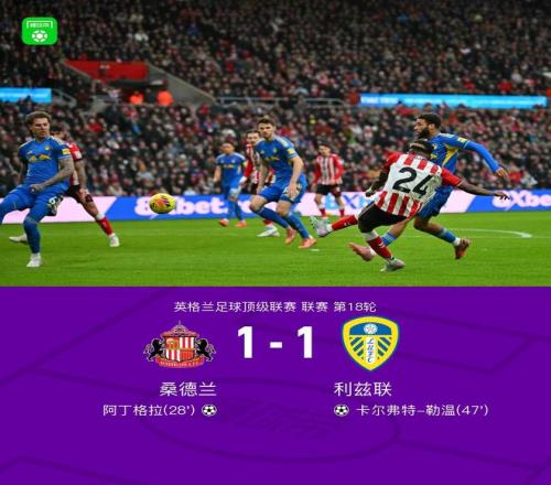 北京时间12月28日英格兰足球顶级联赛 联赛 第18轮,桑德兰主场对阵利兹联。上半场,扎卡助攻阿丁格拉破门。下半场,阿伦森助攻卡尔弗特-勒温扳平。最终比分桑德兰 1-1 战平利兹联。 关键事件 第28分钟,扎卡斜塞,阿丁格拉兜射破门,桑德兰1-0利兹联