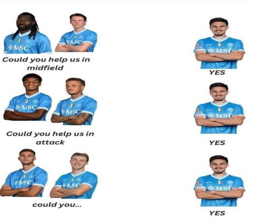 现年26岁去年夏天以租借的方式从莱比锡回到那不勒斯,赛季至今他代表那不勒斯出战了21场比赛,其中11次首发,期间他踢过的位置包括了前腰、中前卫、左中场、左边锋以及右边锋。 对于自己万金油的属性,埃尔马斯也在社交媒体上发了一张梗图进行了自嘲,这张梗图的内容是安古伊萨和麦克托米奈提问:“你能在中场帮助我们吗?”埃尔马斯回复道:“可以。”随后内雷斯和诺阿-朗提问:“你能在进攻端帮助我们吗?”埃尔马斯继续说道:“可以。”最后洛伦佐-卢卡和霍伊伦也提问:“你能......”没等他们问完,埃尔马斯抢答道:“可以。” |