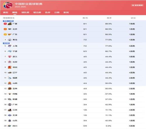 本轮最引人瞩目的当属北京与广东的榜首大战。赛前广东队保持八连胜,是本赛季唯一未尝败绩的球队,而北京队则以7胜1负的战绩紧随其后。这场被视为争冠级别较量的焦点之战,最终以北京队31分大胜告终,广东队8连胜戛然而止。这场失利让广东队从积分榜首位跌至第三,而北京队则凭借这场关键胜利以8胜1负的战绩升至第二。