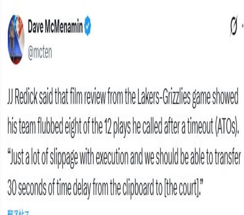 雷迪克批评湖人执行力:12次战术跑错8次艾顿没球权是所有人责任