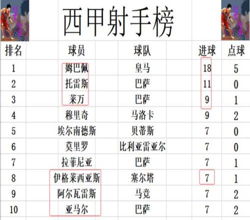 射手榜方面,姆巴佩18球高居榜首,托雷斯今天错失良机未能破门,还是11球排在第2。莱万最后打入一球,追上穆里奇,两人9球并列第3。莫里罗破门,伊格莱西亚斯双响,两人追上亚马尔,阿尔瓦雷斯等人,将前十门槛提高到7球。 |
