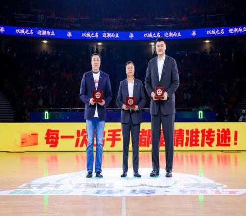 章文琪、李秋平、姚明。 生日夜,全都回来了 当主持人在万体馆喊出“15号姚明”时,这个夜晚对于上海男篮注定不平凡。 这一晚,是上海久事篮球俱乐部三十周岁的生日。早在比赛开始前,球场各处便萦绕着不同寻常的氛围——场馆内,每个座椅都摆放着一件纪念T恤;赛前公告上,俱乐部罗列出一系列事宜:三十周年特展、战歌首唱、纪念物品展示...... 但更重要的,是老友们的回归。 19时15分,灯光聚焦场馆D通道,李秋平、姚明、章文琪三位名宿并肩出现,领取俱乐部特意准备的功勋纪念章。站在台上,上海男篮的几位名宿并未发表感言,但在台上站定之时,姚明拍了拍恩师李秋平的肩膀,时间仿佛切换回了30年前的模样。 彼时,还在青年队训练的姚明并没有一个特别明确的目标,直到1996年1月5日,上海东方俱乐部正式成立。 “刚进青年队的时候,只知道是让我练篮球了,心里并没有一个特别明确的目标,也不知道自己将来会去哪儿,”当时的媒体报道中,接受采访的姚明留下这样一段话,“后来突然间成立了俱乐部,一年之内就打进了甲级联赛。我们当时那些青年队的队员,都觉得好像一下子就看得远了,自己的将来,也肯定就在这条路上。” 与球队名宿一同回来的,还有荣誉。在接受功勋纪念章后,老队长章文琪手持一枚镌刻着2001-2002赛季夺冠阵容全体成员签名的纪念篮球,郑重地交到现任队长王哲林手中,背后的含义不言而喻。