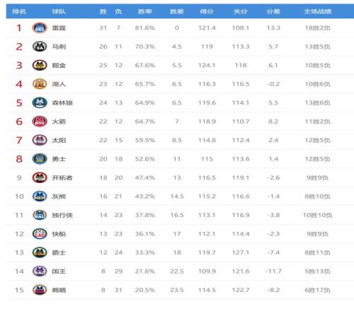快船输球后13胜23负,继续排名西部第12,落后第10的灰熊2.5个胜场,快船想要冲到附加赛区并不容易。 除了上述比赛外,鹈鹕今日输给老鹰17分,鹈鹕输球后8胜31负继续排名西部垫底。今日比赛后湖人、掘金排名互换,森林狼、火箭排名互换,其他西部球队排名不变。