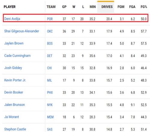 他本赛季的数据也压倒了杜兰特,后者场均得到26.1分5.1篮板4.4助攻。杜兰特是下山的神,而阿夫迪亚是向上冲击的球星。 在4连胜期间,阿夫迪亚场均砍下34.3分8.0篮板7.8助攻,命中率50.0%,三分命中率40.0%,罚球命中率82.0%,他诠释了开拓者新王的价值。 值得一提的是,阿夫迪亚是本赛季的突破之王,场均20.4次突破排名联盟第一,亚历山大17.9次排名第二,杰伦·布朗17.4次第三。阿夫迪亚场均靠突破得到10.1分,还场均靠突破送出2.8次助攻。