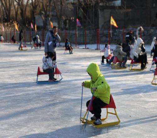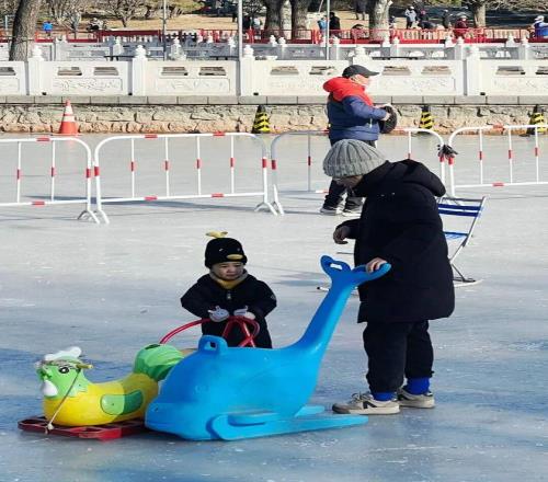西海子冰场藏着 通州几代人的童年回忆—— 传统冰车、冰上自行车 带你重拾怀旧时光 卡通电动冰车、雪橇冰车 让小朋友嗨玩不停……
