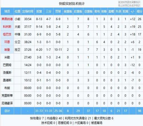 | 莱昂纳德26分8板1助3断、科林斯25分7板1助5断4帽、哈登19分7板7助3断、祖巴茨17分6板1助2帽、米勒9分1板1助、邓恩2分1板6助4断 罗宾逊20分2板1助、霍兰16分6板1助、詹金斯10分4板2助2断、史密斯9分14板1助4帽、里德8分7板3助5断2帽、艾维8分3板、勒韦尔8分1板4助2断