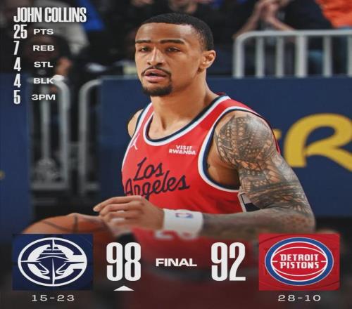 | 北京时间1月11日,NBA常规赛:快船客场98-92逆转活塞,本赛季双杀东部第一。快船内线科林斯表现出色,投篮14中9,三分8中5,罚球4中2,砍下25分7篮板1助攻4抢断4盖帽,正负值+19全场最高。最近11场比赛,快船9胜2负。