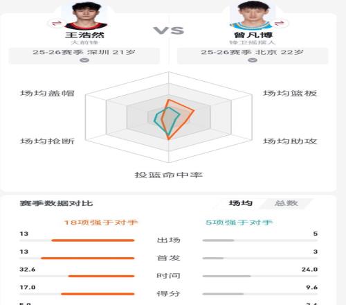 和张镇麟相比,王浩然也有16项数据强于对手,再来和朱俊龙对比,王浩然更是全面碾压。