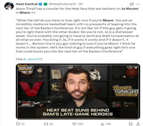 前NBA球员路威也认为热火的文化可以为莫兰特提供全新的起点,斯波尔斯特是美国男篮的主帅,如果莫兰特想要代表美国出战2028年洛杉矶奥运会他就必须完全听从斯波的安排,莫兰特加盟热火融入这支球队后会产生跟特雷杨交易一样的效果。