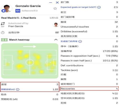 b. 身体素质限制上限:传球也需要继续打磨 贡萨洛在比赛中做了很多基础的工作,可以给比他更强的队友提供帮助,也能得到队友的“供养”,不过他单兵不够强还是一目了然的。 与巴萨的西超杯决赛上,贡萨洛6次一对一对抗输了5次,仅仅只有19次触球就丢球权7次,这样的数据也充分说明了他的问题。
