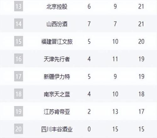 福建队、天津队、新疆队、同曦队分列第十五至第十八位。江苏队凭借击败北控的胜利,战绩提升至2胜13负,终结连败,排名升至第十九。四川队15连败垫底,赛季前景黯淡。