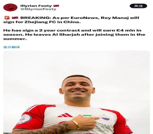 现年28岁的马纳伊为阿尔巴尼亚现役国脚,此前曾代表国米一线队出场6次,去年7月底加盟阿联酋球队沙迦FC,双方签约至2027年。本赛季至今,马纳伊代表沙迦FC出场20场,贡献6粒进球。 目前浙江队阵中仅有米特里策、此前官宣的朴镇燮以及接近续约的卢卡斯,五外援阵容仍有2个名额的空缺。