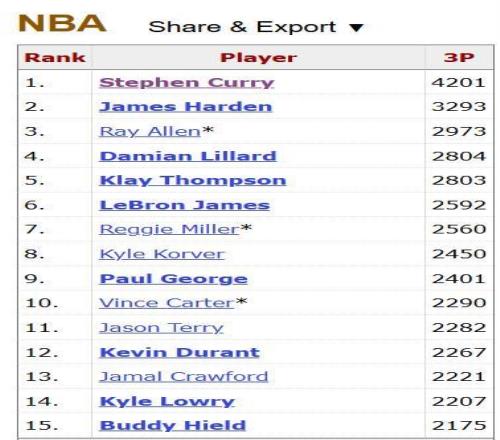 斯蒂芬-库里 4201 詹姆斯-哈登 3293 雷-阿伦 2973 克莱-汤普森 2805 达米安-利拉德 2804
