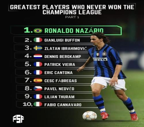 | 最近Fsf发布了“从未赢得欧冠冠军的最伟大球员”榜单第一部分,罗纳尔多、布冯、伊布、博格坎普、维埃拉这些名字都在列。名单里最刺眼的反差其实只集中在罗纳尔多身上:很多足球历史排名里,他往往被默认放进前十,甚至被放到更靠前的位置,可一翻欧冠冠军这一栏却是0,这种落差才会让人觉得特别别扭、特别尴尬——你越把他当成历史顶层的前锋,这个“0”就越显眼 具体排名罗纳尔多 | Ronaldo NAZÁRIO 国籍:巴西 位置:前锋 效力俱乐部:埃因霍温、巴塞罗那、国际米兰、皇家马德里、AC米兰