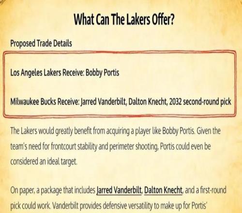 美媒《Fadeaway World》撰文建议,湖人应该打包送出范德比尔特、克内克特以及2032年的首轮签,从雄鹿引入波蒂斯。 1995年出生的波蒂斯,今年30岁,2015年选秀大会上,他在首轮22顺位被公牛选中登陆NBA,至今已征战11个赛季,生涯场均可以得到12.2分7.2篮板。期间曾帮助雄鹿夺得总冠军和NBA杯冠军。