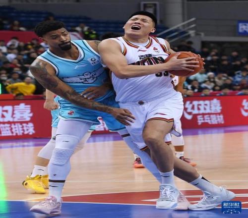 1月15日,青岛崂山啤酒队球员米奇(左)在比赛中防守吉林长白山恩都里队球员曾繁日。新华社记者 李紫恒 摄