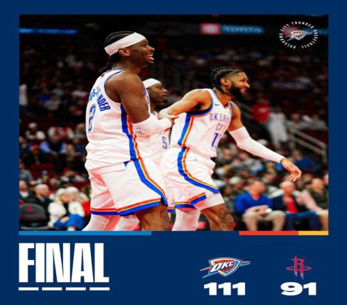 | 篮球直播站1月16日报道: NBA常规赛继续进行,休斯敦火箭队(23胜15负)又遭败仗。亚历山大得到20分,霍姆格伦得到18分和9个篮板,他们率队在第四节打出进攻高潮确立大比分优势,俄克拉荷马城雷霆队(34胜7负)在客场以111-91大胜火箭队。雷霆队拿到5连胜。 雷霆队的亚历山大得到20分和4次助攻,霍姆格伦得到18分和9个篮板,米切尔得到17分和5个篮板,多尔特得到13分,威廉姆斯得到6分、5个篮板和10次助攻。火箭队的杜兰特得到19分和7个篮板,史密斯得到17分和10个篮板,申京得到14分、13个篮板和5次助攻,汤普森得到13分和9个篮板,亚当斯得到6分和11个篮板。