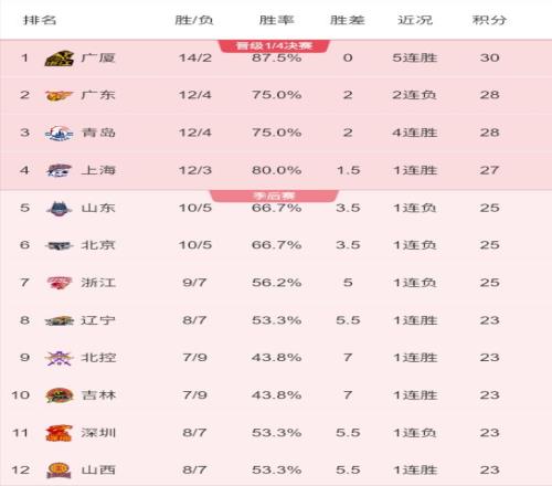 联赛积分榜前12名排名:广厦、广东、青岛、上海、山东、北京、浙江、辽宁、北控、吉林、深圳和山西。 |