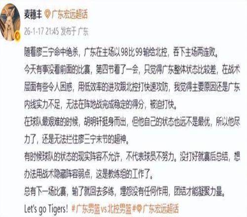 上一轮惨败给上海队40分,这一轮又被北控队给绝杀了,广东队为何会如此不堪呢?要知道,这支球队是喊出要夺冠的。赛后,广东媒体人麦穗丰老师给出了答案,矛头直指教练组。 麦穗丰老师在社交平台写道:“今天有事没看前面的比赛,第四节看了一会,只觉得广东整体状态比较差,在战术层面有些令人困惑,用低效率的进攻跟北控打快速攻防,我觉得主要原因还是广东内线实力不足,无法在阵地战完成稳定的得分,被迫打快。”