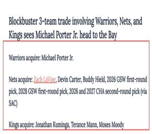 联盟内部对这笔交易的共识是,多方框架是实现共赢的唯一路径。由于勇士对小波特的兴趣明确,而篮网渴望积累更多重建资产,库明加成为了关键的“桥梁型筹码”。这位23岁锋线在1月15日交易限制解除后,其合同价值被重新激活——2026-27赛季2430万美元的球队选项,既具备薪资匹配的灵活性,又能为第三方球队提供后续操作空间,被管理层视为“复杂交易中的优质资产”。最终浮出水面的潜在方案的核心的是:勇士引进小迈克尔·波特;篮网收获扎克·拉文、德文·卡特、巴迪·希尔德,以及勇士2026年、2028年首轮签和通过国王获得的2026、2027年黄蜂次轮签;国王则得到乔纳森·库明加、特伦斯·曼与摩西·穆迪。