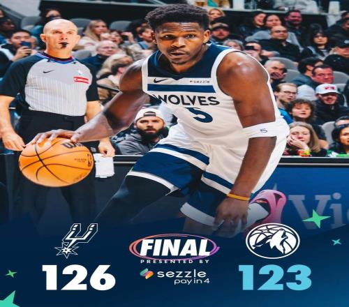 芬奇请求暂停,随后抱怨判罚吃到技术犯规,文班亚马罚球不中,爱德华兹轰进续命远投。米奇约翰逊请求暂停,福克斯2罚全中,爱德华兹2罚1中,尚帕尼2罚不中。文班亚马抢下前场篮板被爱德华兹犯规,文班亚马2罚1中。距离终场仅剩1.3秒,爱德华兹超远绝平3分球不中,比赛时间走完。最终,马刺以126比123险胜森林狼,拒绝了25分逆转。 两队数据 森林狼队,麦克丹尼尔斯14中7砍下了23分5板5助、兰德尔13中4,三分球2中0得到17分10板1助2断2帽、迪文岑佐14中4,三分球10中3得到了11分5板3助2断、贝兰热6中5贡献10分8板3助2帽、海兰德3中3得到7分1板1助、克拉克3板2助、康利2板3助、朱赞2板、米勒1板1助。 森林狼惜败马刺