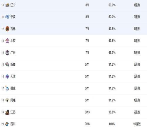 辽宁、宁波排在10和11。现在辽宁的情况非常糟糕,外援和本土球员的水平都不行,他们只能尽可能巩固季后赛的席位。宁波也是8胜8负,但他们已经两连败了,他们欠缺锋线,后续的赛程还比较艰难,看看能不能顶住吧。 12-14分别是吉林、北控和广州。吉林这轮大胜四川,艰难巩固住季后赛席位。北控绝杀广东,这场比赛他们攻守回暖,期待复苏。广州已经三连败了,排名持续下滑。