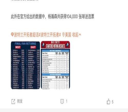 根据开拓者官方球队透露的数据,杨瀚森这一次的全明星投票一共是获得了10.4万的票数。除此之外,他的数据排名整个NBA联盟第36名。作为一名NBA新秀球员能够获得10万票,而且排名整个联盟第36名,说实话其实已经相当了不起了。这意味着国内外有很多球迷都在给杨瀚森投票,虽然最终没有能够登上榜单,但其实也看得出来我们背后庞大华人球迷的市场。一旦杨瀚森将来可以在NBA站稳脚跟,打出亮眼的数据,他极有可能能够被我们全球的华人球迷直接给送进NBA全明星的替补,甚至是首发。所以关键还是要杨瀚森自己争气。