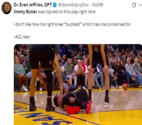 果不其然,比赛后仅仅不到3个小时,NBA知名记者Shams Charania确认了这一噩耗:勇士球星吉米·巴特勒遭遇右膝前十字韧带撕裂,将缺席本赛季剩余的所有比赛! 巴特勒的伤病给勇士队的赛季前景蒙上了一层厚厚的阴影。本赛季至今,巴特勒场均能够贡献20分5.6篮板4.9助攻1.4抢断的全面数据,是勇士队攻防两端最不可或缺的核心球员之一。
