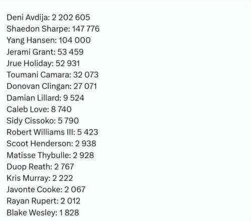 杨瀚森被召回后,也第一时间参加了今日球队的训练。今天和明天,开拓者都没有比赛,罕见的可以安排球队训练。1月23日,开拓者和混音都有比赛,届时杨瀚森是否被下放还未确定。 有媒体统计了开拓者球员在球迷投票环节的得票情况。阿夫迪亚2202605票断层领先全队,开拓者得票第二多的球员是谢登-夏普,他得到147776票,而杨瀚森得到104000票,位居第三。格兰特和霍勒迪分列第四和第五。以下是所有人的具体票数——