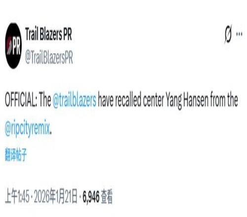 | 北京时间1月21日,开拓者官方宣布从混音队召回杨瀚森。另外,有媒体统计了开拓者队内所有球员的全明星球迷得票,杨瀚森排名第三。