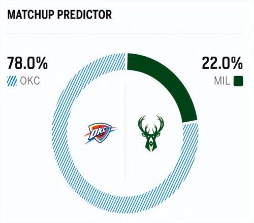 作为对比,雷霆队本赛季继续展现了冠军级别的统治力,目前以36胜8负的战绩,断崖式领先,高居全联盟第一。数据显示,雷霆队场均得到121.4分,仅失108分,净胜分高达13.4分,历史级别的净效率,攻防两端表现均衡。而霍姆格伦与字母哥的内线攻防较量,是本场最大的看点。 赛前,美媒ESPN对本场比赛进行了胜率预测,雷霆队胜率依旧高达78.0%,占据绝对上风,雄鹿胜率则仅有22.0%,还是不被看好。