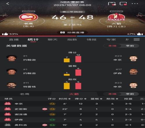 雷速体育10月7日讯 今日NBA季前赛继续进行。 有细心的雷速老哥也许发现了,NBA季前赛出现多场比赛数据和实际转播画面不符的情况,例如今日老鹰对阵火箭的比赛。 阿门·汤普森和小贾巴里·史密斯在第二节还剩6分钟左右的时候,出场时间竟然高达22分钟,期间一度有球员出场时间比比赛时长还多2分钟。此外,官方最后时刻也将双方的得分搞错。近期NBA官方出现此类失误较多,各方转播也处于磨合之中,各位雷速老哥如发现数据有误欢迎指正,我们也会第一时间将正确的比赛数据更新! |