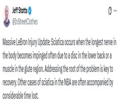 北京时间10月10日,据湖人随队记者Dave McMenamin报道,湖人官方已经宣布,詹姆斯因右侧坐骨神经痛将再休战3-4周,将缺席新赛季的开局阶段,这意味着他将生涯首次缺席常规赛揭幕战,此前他已经连续22次参加揭幕战。 自从新赛季媒体日至今,詹姆斯因伤仅仅进行个人训练,一直没有参加球队的完整训练,而且此前已经缺席了两场季前赛;由于遭遇坐骨神经痛,他不仅缺席全部的季前赛,而且将缺席新赛季初期的比赛,坐骨神经痛是指疼痛从脊柱发出并沿腿部后侧放射的症状。 距离新赛季开打还有12天,詹姆斯因伤至少再休战3-4周,这意味着他将缺席新赛季1-2周的比赛,按照詹姆斯缺席的时间推算,湖人这段时间预计会打5-9场比赛;湖人新赛季前10场的对手分别为:勇士(主)、森林狼(主)、国王(客)、开拓者(主)、森林狼(客)、灰熊(客)、热火(主)、开拓者(客)、马刺(主)、老鹰(客)。 对于詹姆斯的伤势恢复情况,雷迪克表示詹姆斯有他自己的恢复时间表。 医学专家Evan Jeffries表示,詹姆斯将缺席2025-26赛季初期的比赛,他将在3-4周后重新评估坐骨神经痛,如果一切顺利,疼痛可能需要1-2周的恢复期,并且可能至少需要4-6周的时间才能康复。 另一医学专家Jeff Stotts表示,勒布朗伤情重大更新:坐骨神经痛的发生是由于人体最长的神经受到压迫所致,压迫通常源于腰椎间盘或臀部肌肉问题。解决问题的根源是康复的关键。NBA中其他坐骨神经痛病例往往伴随着长期休战;NBA名宿纳什曾遭遇过这样的伤病。 |
